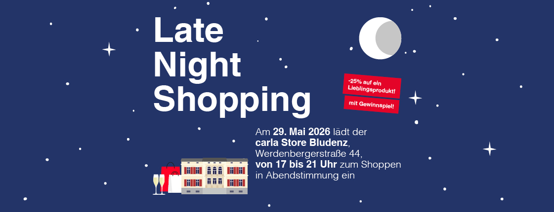 Am Freitag, 29. Mai laden wir euch herzlich zum Late Night Shopping in den carla Store Bludenz ein! Von 17 bis 21 Uhr könnt ihr entspannt stöbern, neue Lieblingsstücke entdecken und dabei mit einem Gläsle Prosecco oder Bier mit uns anstoßen.